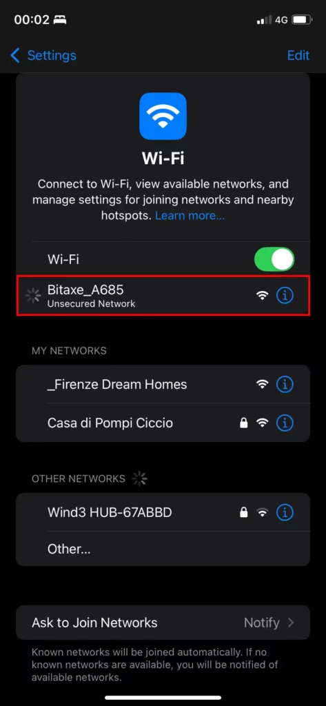 The Bitaxe_XXXX network is the miner’s Wi-Fi setup interface. Connect to it from a laptop or phone, and a setup page should appear.