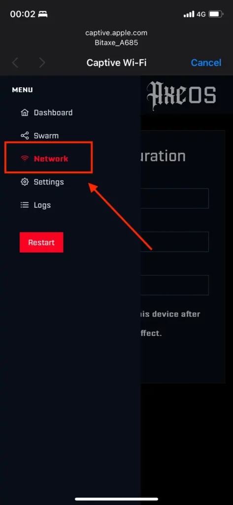 192.168.4.1in a browser. - From the sidebar on AxeOS, select network and then type your home Wi-Fi and enter the correct SSID and password. Then save and restart the Bitaxe.