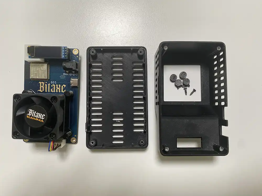 - Bitaxe Gamma – Fully enclosed, featuring a high-performance cooling system, an ultra-quiet fan, and branded logos.