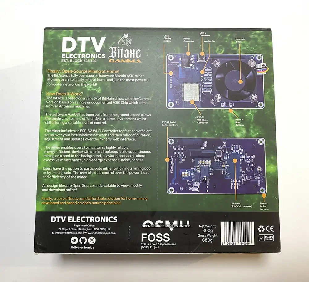 The Bitaxe Gamma arrives double-boxed in a sleek DTV Electronics package, designed to highlight the key details of the device.