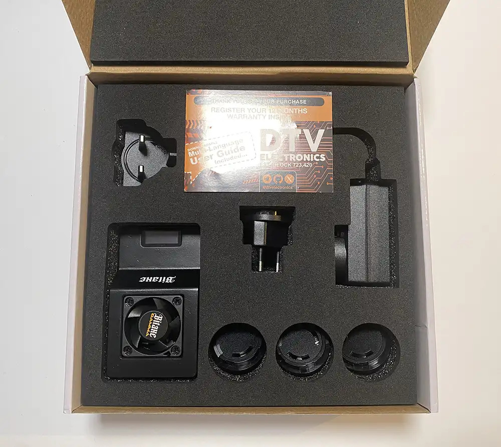 Opening the package, a hard polystyrene shell protects the contents. Many open-source projects ship with minimal packaging, but that’s definitely not the case here—DTV Electronics has put real effort into safeguarding the miner during transit.