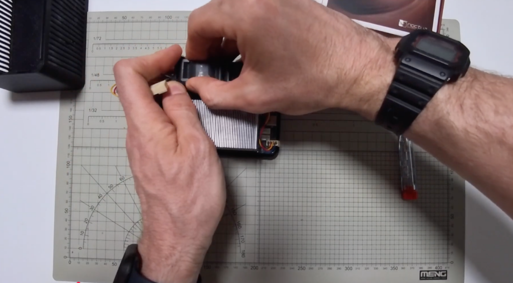 Plug the Noctua fans into the same headers used by the original ones. The connectors are keyed, so they should slide in naturally.