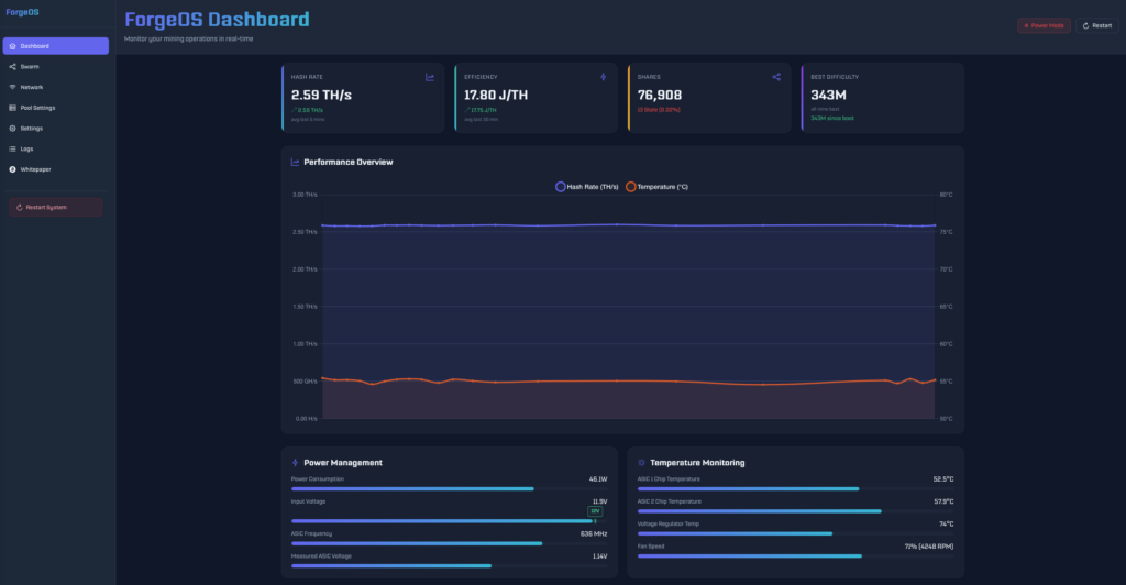 You can also adjust performance settings if ForgeOS offers different power modes or frequency options. Higher frequencies increase hashrate but also boost power consumption and heat output.