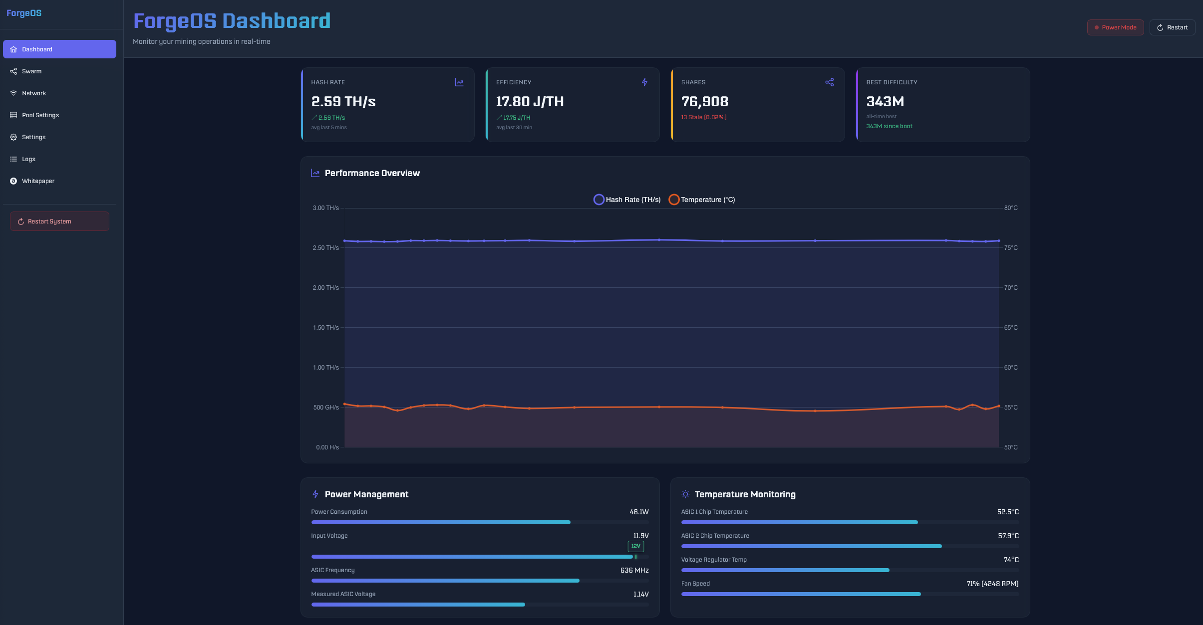 You can also adjust performance settings if ForgeOS offers different power modes or frequency options. Higher frequencies increase hashrate but also boost power consumption and heat output.