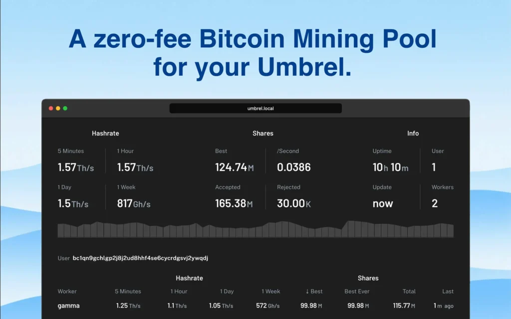 If you successfully mine a block, you receive the entire block reward. No splitting with other miners. No fees. No middleman. On umbrelOS, Public Pool is automatically configured to work with your Bitcoin node—no extra setup required. Simply install the app, and it’s ready to go.